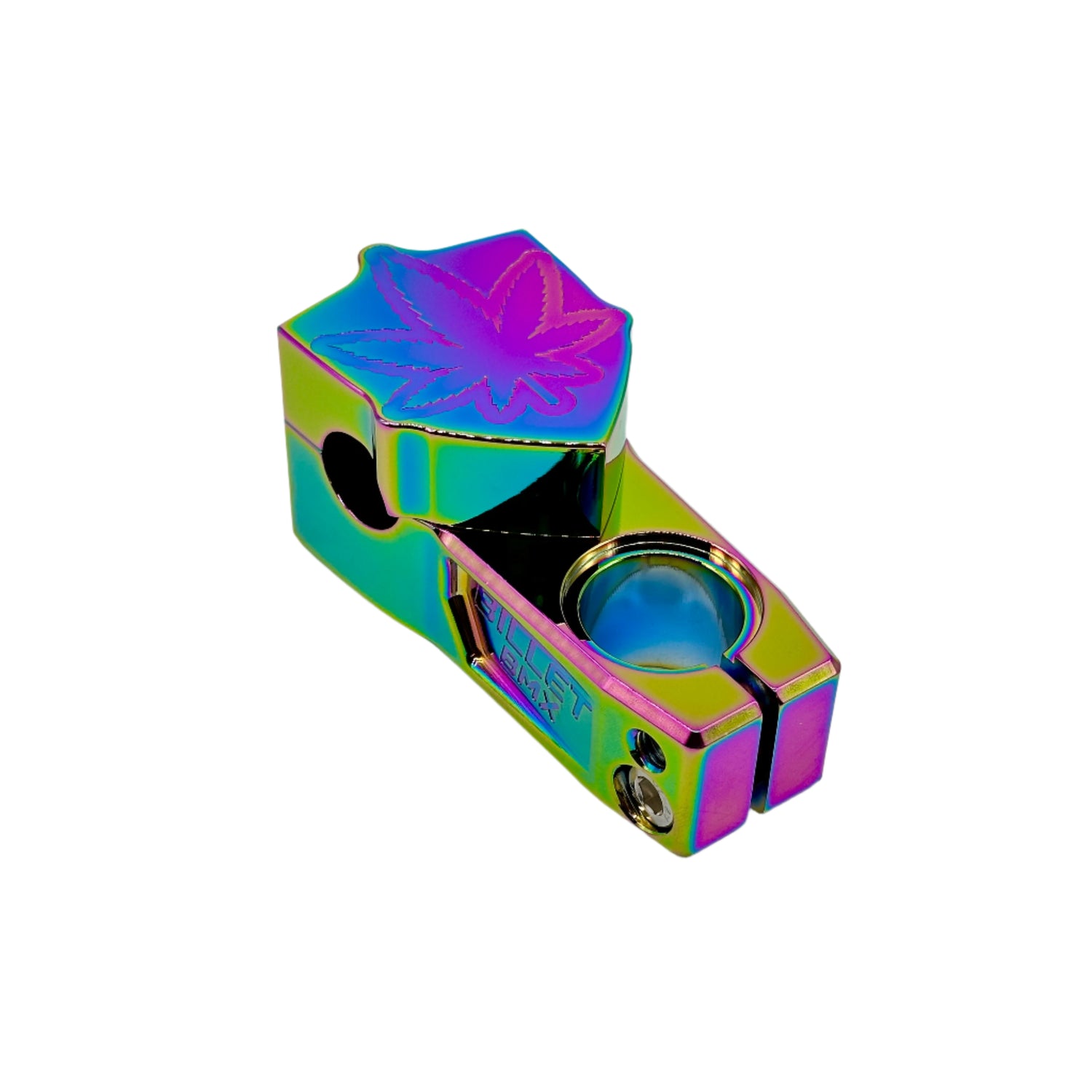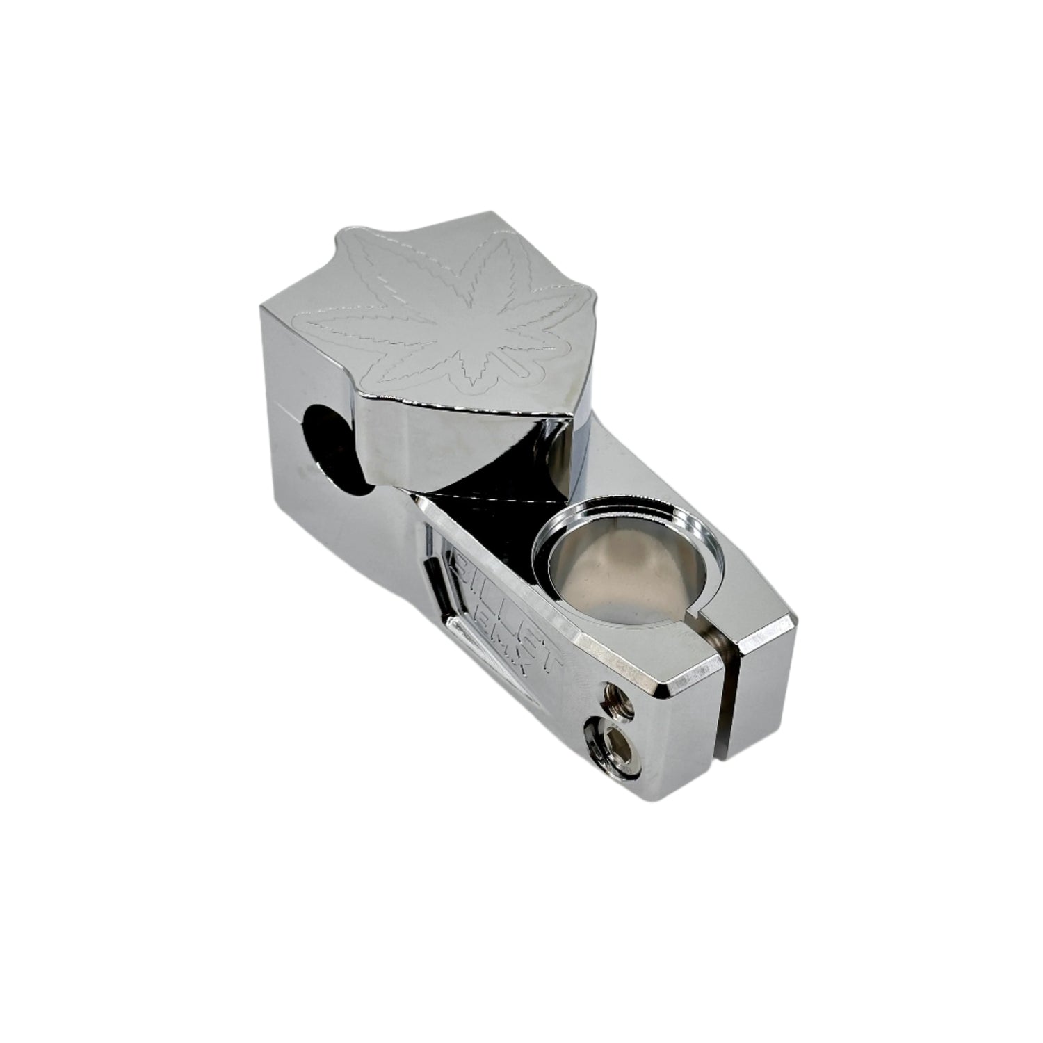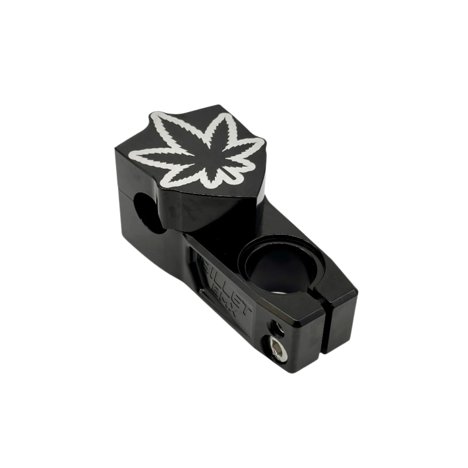Billet BMX Weed lead Top Load Stem with 57mm Throw Collector Series. This stem can be run either top load showing our engraved Weed Leaf Logo or inverted showing our engraved Billet BMX Logo. Full CNC Machined 6061 T-6 Aluminum with High Detailed Engraving. Includes Stainless Steel Hardware and fits 1-1/8" threadless forks. Available in multiple Anodized Color Finishes and Chrome.